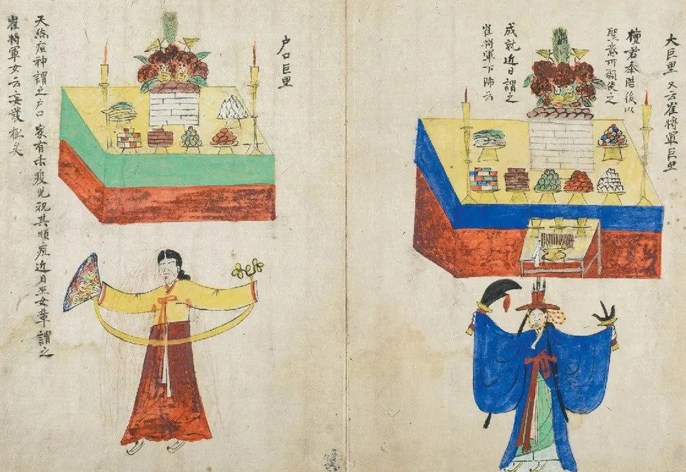 There are different types of mudangs. Some inherit ritual authority through family lines, known as sessŭmu. Others are called through possession and initiation, charismatic gangshinmu. In practice, these distinctions are not always rigid. Blurred lines. What remains constant is the structure: calling, recognition, initiation, and responsibility.